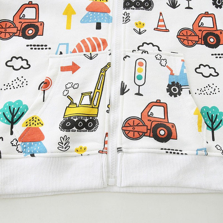 Let your little builder's imagination run wild in this fun excavator jacket! Featuring an allover cartoon print of cheerful construction vehicles, it's perfect for kids who love trucks and outdoor adventures. The playful design keeps things exciting while the durable fabric stands up to active play. Whether he's digging in the sandbox or heading out for a casual day, this jacket brings construction-themed fun to his everyday wardrobe.