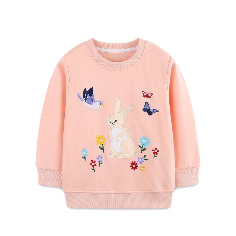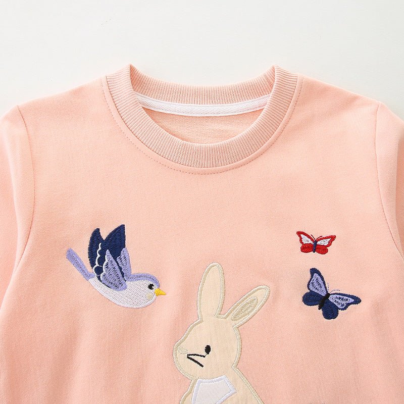 This charming pink sweatshirt features delightful bird and rabbit embroidery, perfect for your little girl's playful adventures. Soft and cozy, it keeps toddlers comfortable while adding a touch of whimsy to their everyday outfit. Easy to wear and cute to boot, it’s a wonderful pick for brightening up any day.