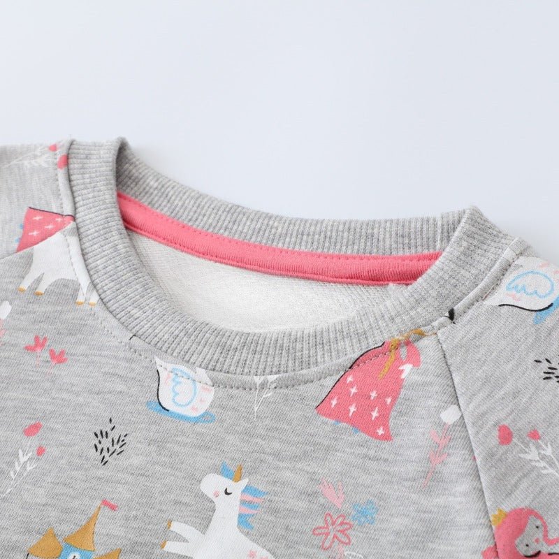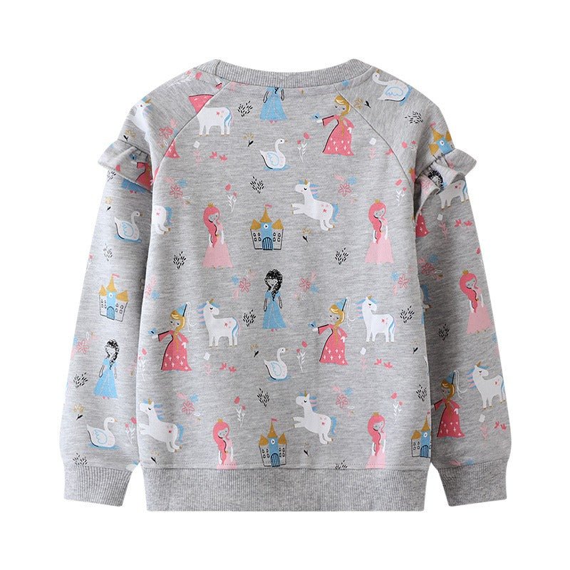 Let your little princess dream big in this enchanting sweatshirt featuring whimsical cartoon princesses and magical unicorns. Crafted from soft, cozy fabric, it's perfect for playdates, adventures, or cozy days at home. The vibrant print captures her imagination while the comfortable fit allows freedom to run, jump, and explore. A delightful addition to any girl's wardrobe that celebrates her love of fairy tales and fantasy!