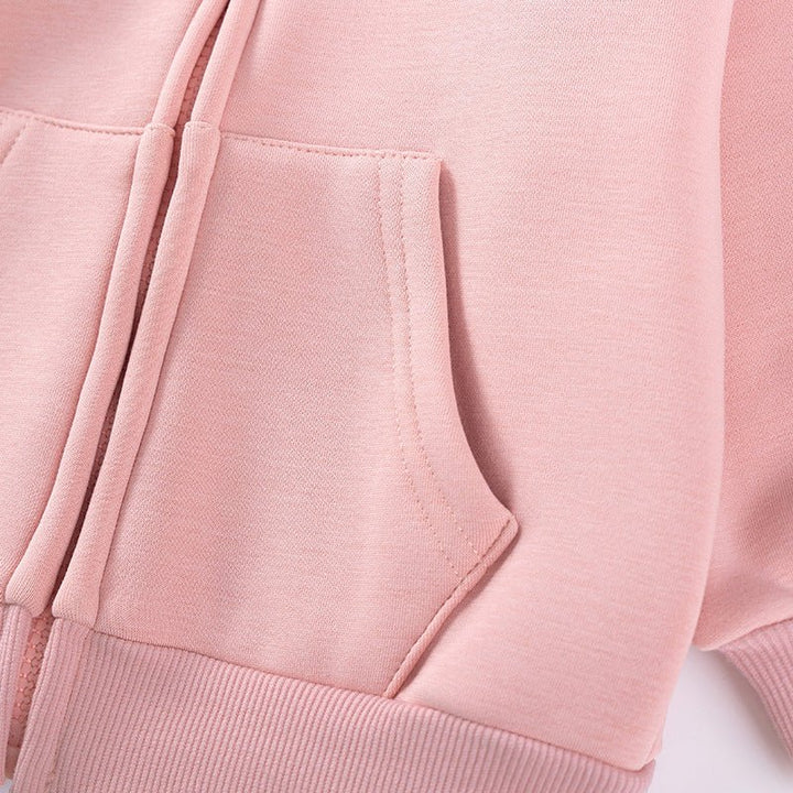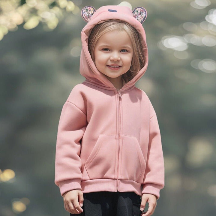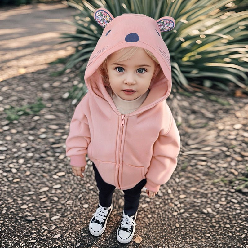 This adorable pink jacket features a charming little mouse embroidery that adds a touch of whimsy to your toddler or kid girl's wardrobe. Perfect for playdates or outings, it combines cozy comfort with playful style to keep her warm and cheerful all day long.