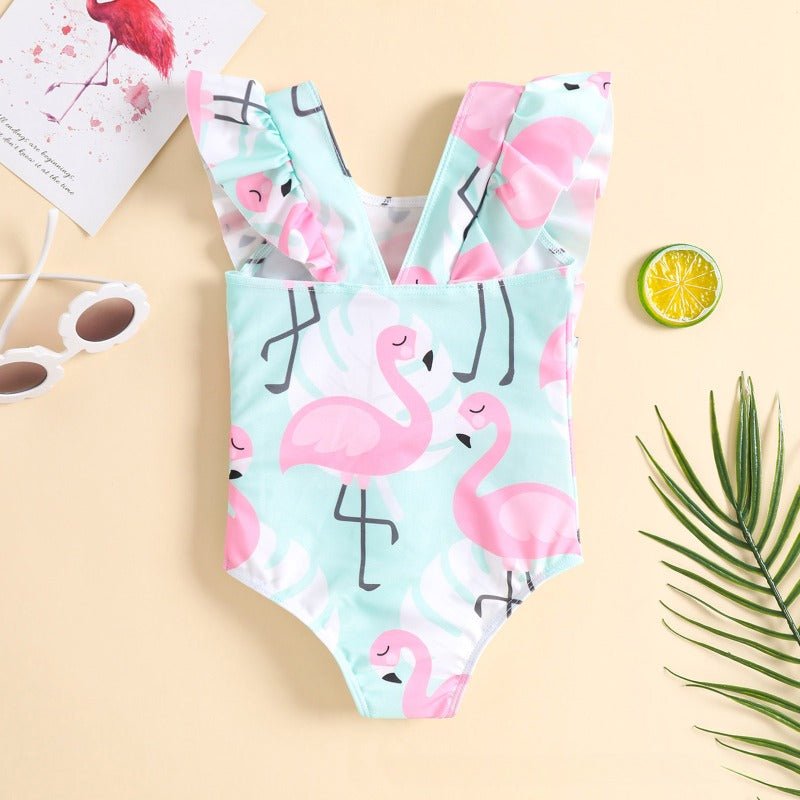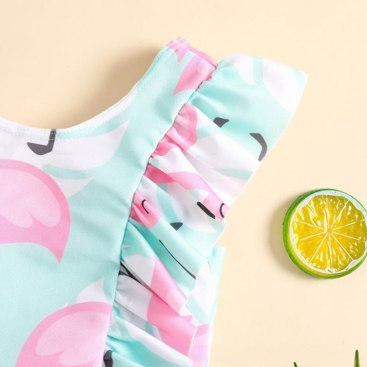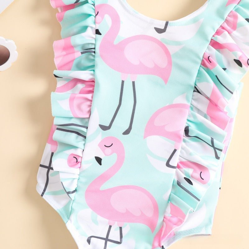 Make a splash with this playful light green swimsuit featuring adorable flamingo prints and charming ruffled details. Designed for toddler and kid girls, it combines comfort and fun, perfect for sunny days at the pool or beach. The soft fabric ensures easy movement while the vibrant design adds a touch of whimsy to every swim adventure.