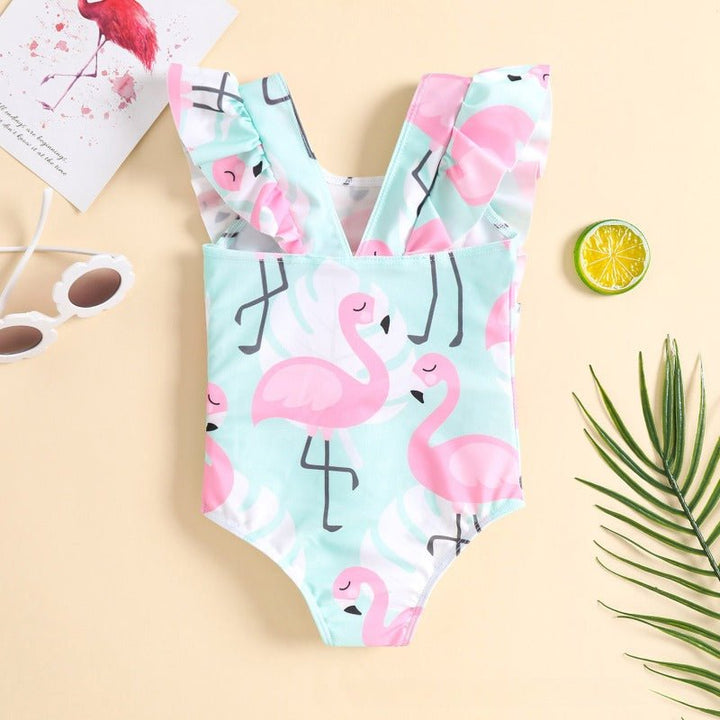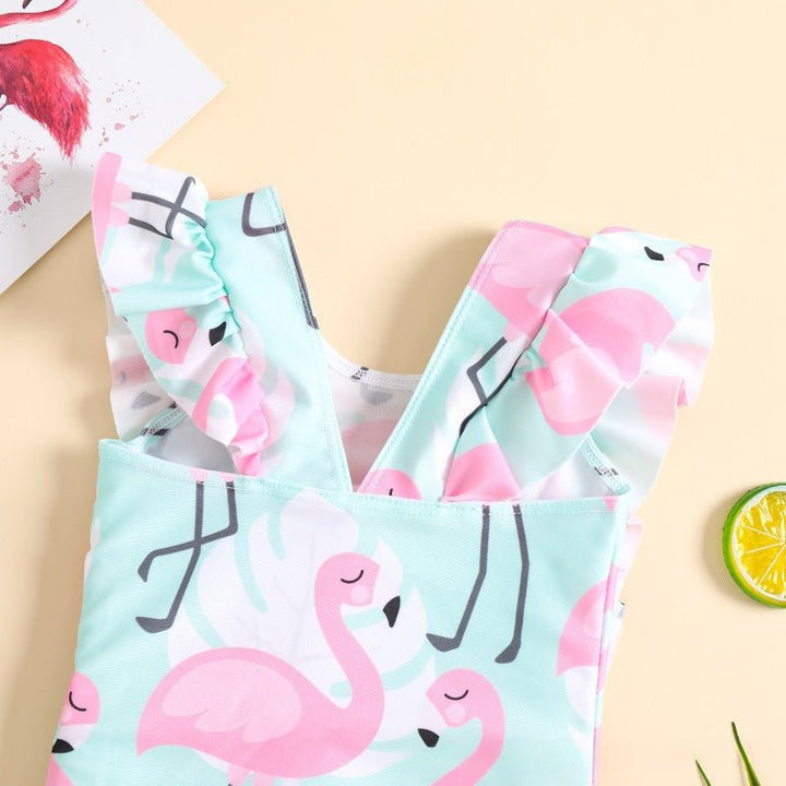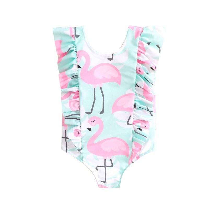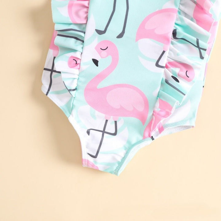 Toddler/Kid Girl Flamingos Print Ruffled Design Light Green Swimsuit