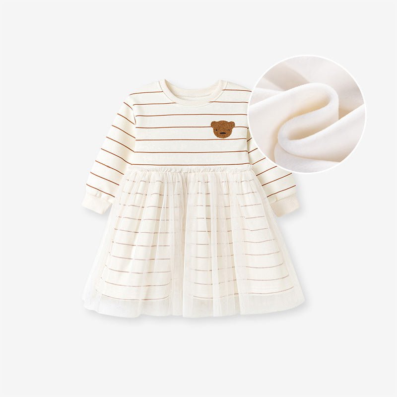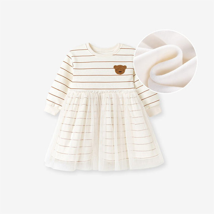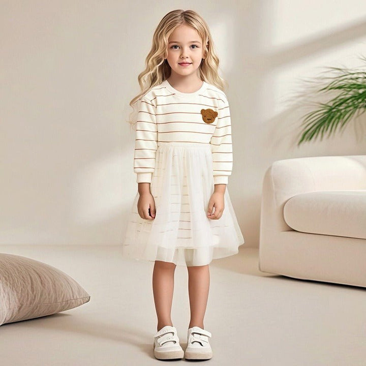 Toddler/Kid Girl Long Sleeve "Let's Be Friends" and Bear Embroidery Designs Dress