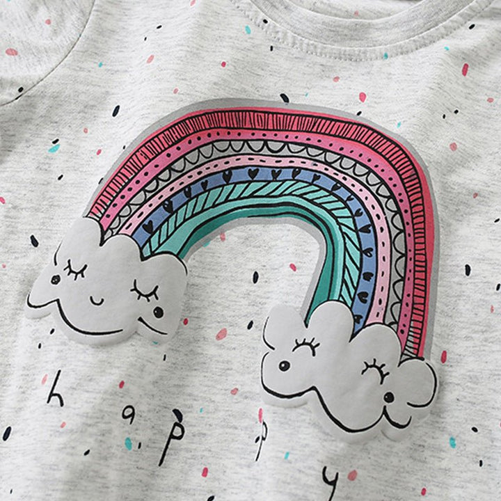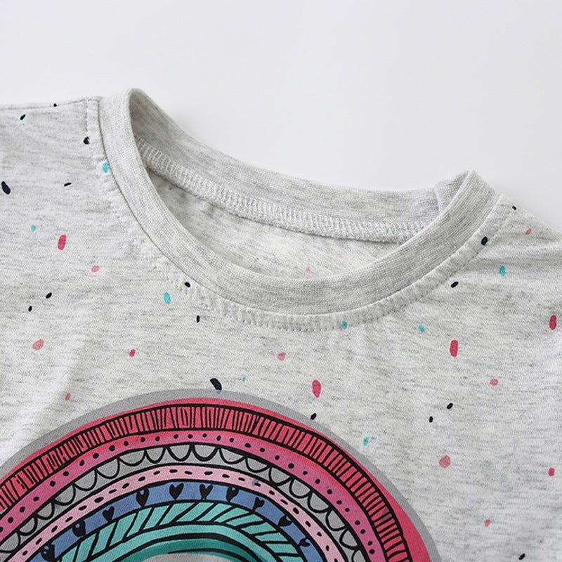 This cozy gray long-sleeve t-shirt brings fun to any little girl's wardrobe with its cheerful rainbow print. Perfect for playful days and cool nights, it’s soft and comfy to keep your toddler or kid feeling happy and snug all day long. Easy to mix and match, it adds a splash of color to every adventure!