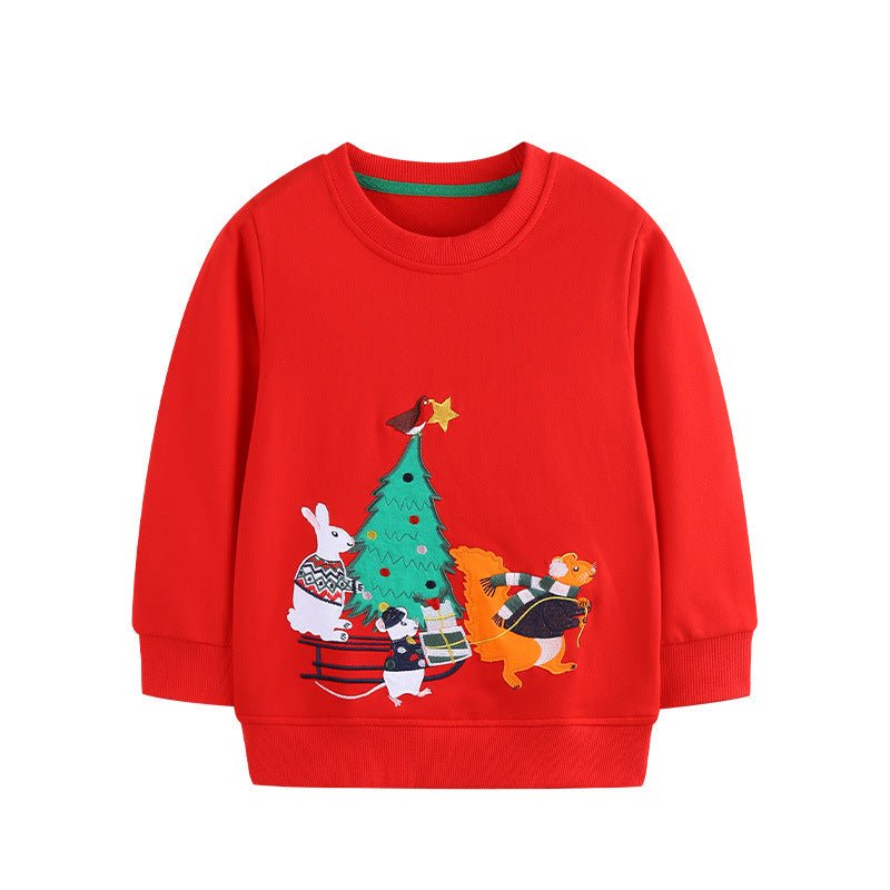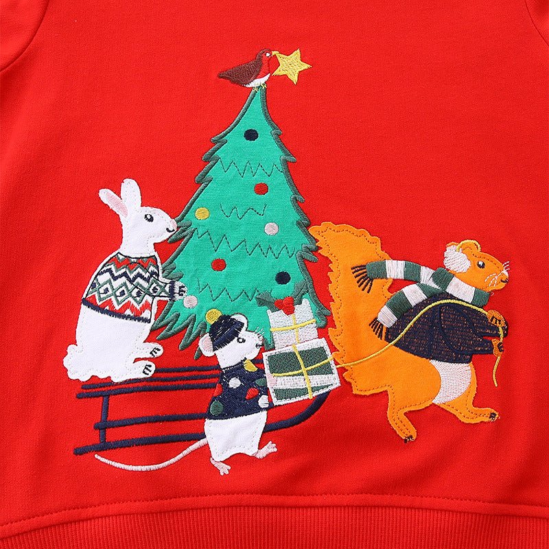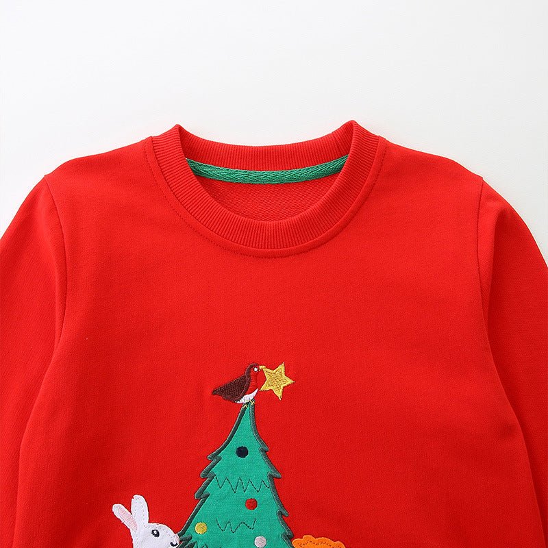 Hop into the holiday spirit with this adorable red sweatshirt featuring festive Christmas tree and bunny embroidery! Perfect for little ones who love seasonal charm, this cozy pullover combines comfort with whimsical design. The soft fabric keeps kids warm during chilly days, while the charming embroidered details make it an instant favorite for holiday gatherings, family photos, and winter adventures. A delightful way to spread joy and festive cheer!