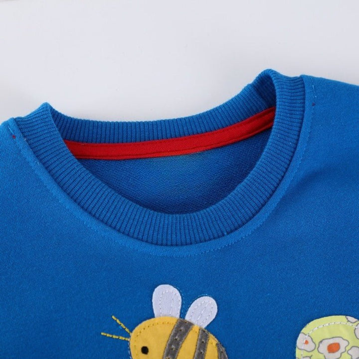 Brighten your little one’s day with this playful blue sweatshirt featuring charming flower and bee embroidery. Soft and cozy, it’s perfect for active toddlers and kids who love to explore. The fun design adds a splash of nature-inspired joy to their outfit, making every playtime a little more cheerful.